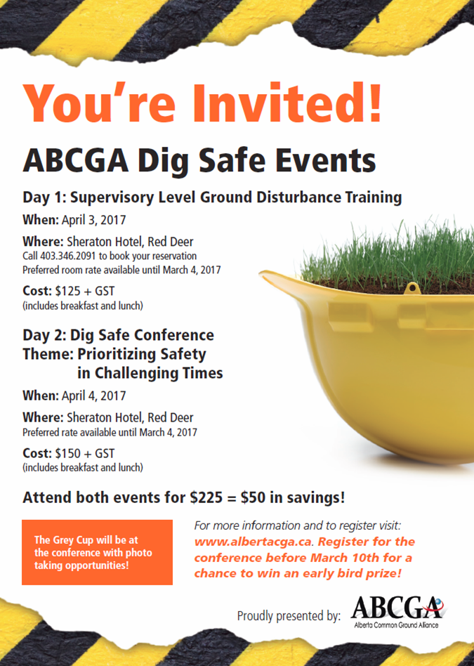 Once again, we will be participating in the annual Alberta Common Ground Alliance (ABCGA) Dig Safe Conference in April. This year’s conference is being held at the Sheraton Hotel in Red Deer on April 3 and 4, 2017.