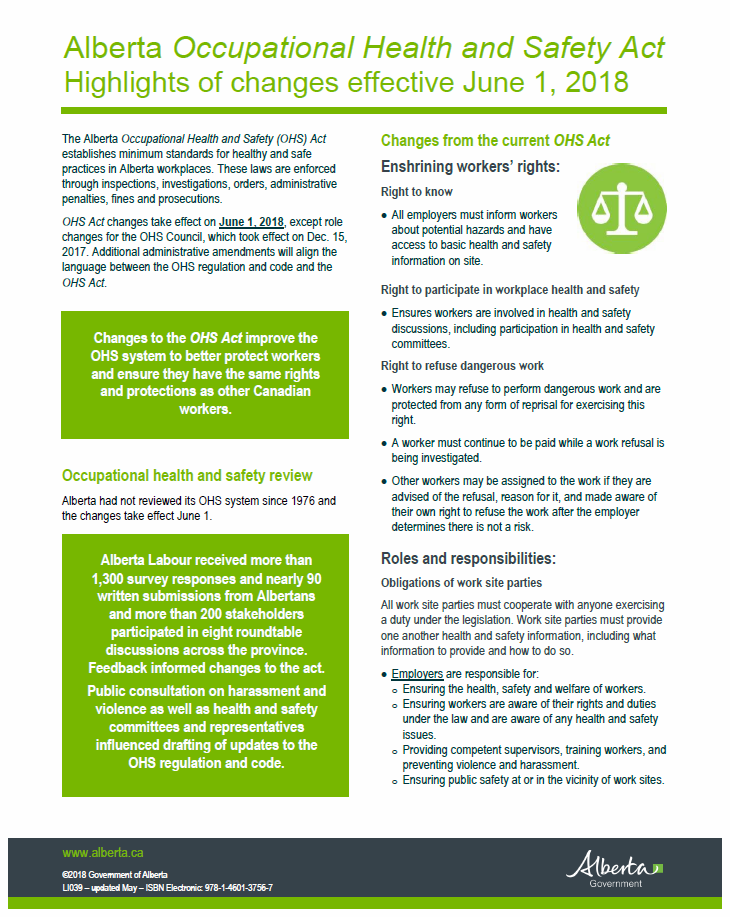 Changes to the Alberta Occupational Health and Safety Act came into effect on June 1, 2018.
