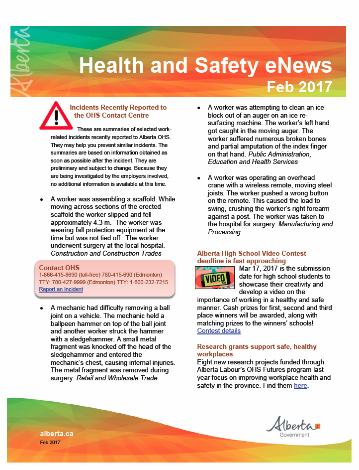 Every month, Alberta OH&S sends out an e-news bulletin with relevant information for employers, workers and others regarding workplace safety in the province. Included in some of these reports are incident summaries consisting of injuries or fatalities that have been recently reported. It is so important that we learn from the experiences of others as doing so may help us to avoid similar incidents.