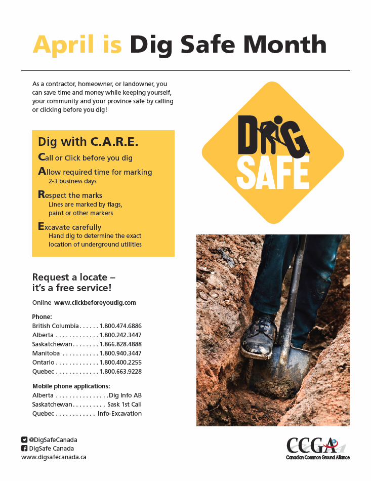 April 1st marks the beginning of Dig Safe Month across Canada. Common Ground Alliances across the country take the opportunity each April to promote the importance of digging with C.A.R.E. – Click before you dig. Allow time for locates. Respect the locates. Excavate with care.