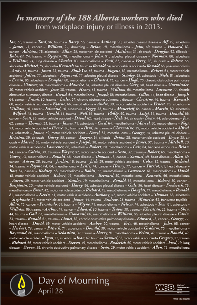 188 workers in Alberta died as a result of workplace injury or illness in 2013. Their loss is felt by everyone.