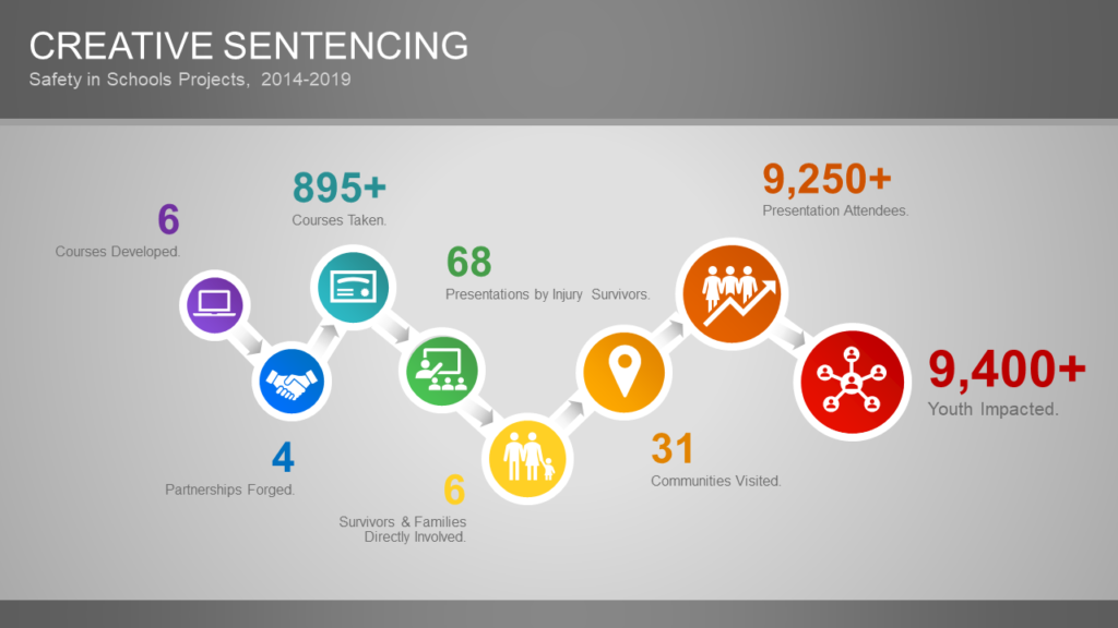 Six online courses, one video and essay contest, and seven school speaking tours, all funded through Creative Sentencing, have directly impacted more than 9,400 students across Alberta with lessons drawn from real life incidents and shared by the real people involved in them.